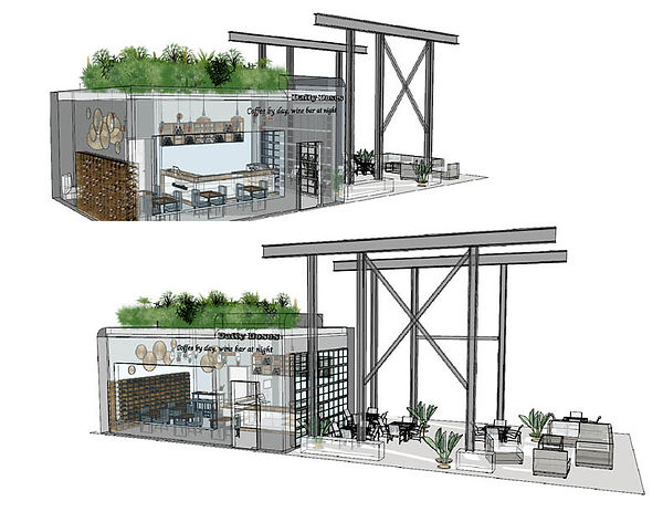 This project comes from a mixed-base project designed by Public Architecture. The concept of Daily Doses, a coffee shop by day and a wine bar at night, was created for an existing commercial building that is embedded and located in front of a micro-unit housing building. The objective was to conceptualize, develop, and detail a project whose use is supportive of the residential complex as well as the surrounding neighborhood.